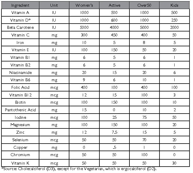 Below is our recommendation for the proper daily MVM formula, which must also be in a tablet to make sure the nutrient delivery is protected and controlled: